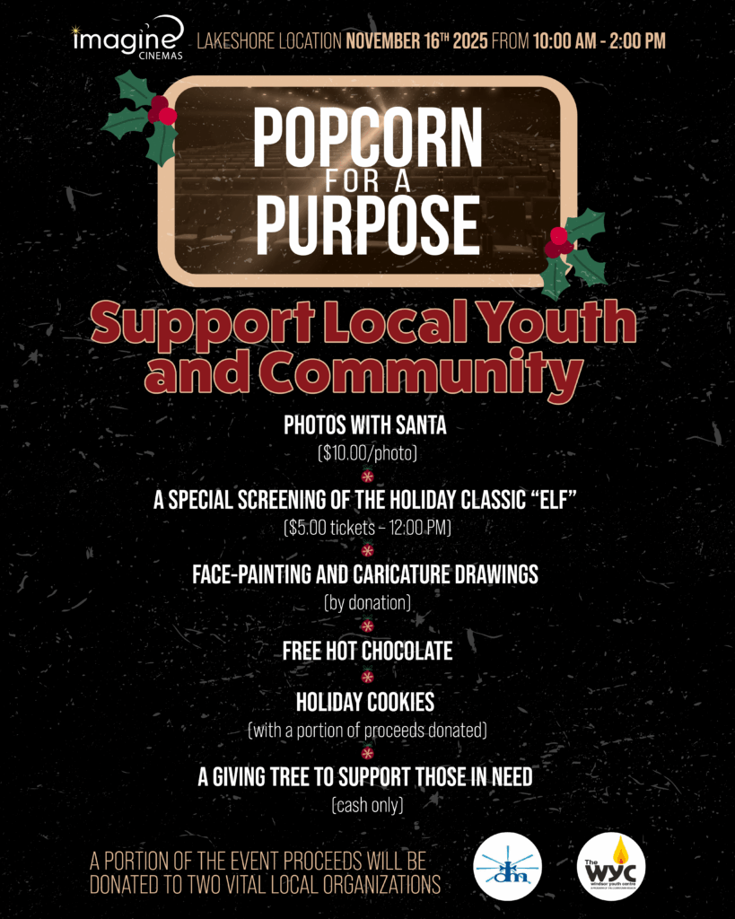 Celebrate the season with Imagine Cinemas Lakeshore at this festive community event! Enjoy photos with Santa & Mrs. Claus, a special screening of Elf, face painting, caricatures, treats, and more.